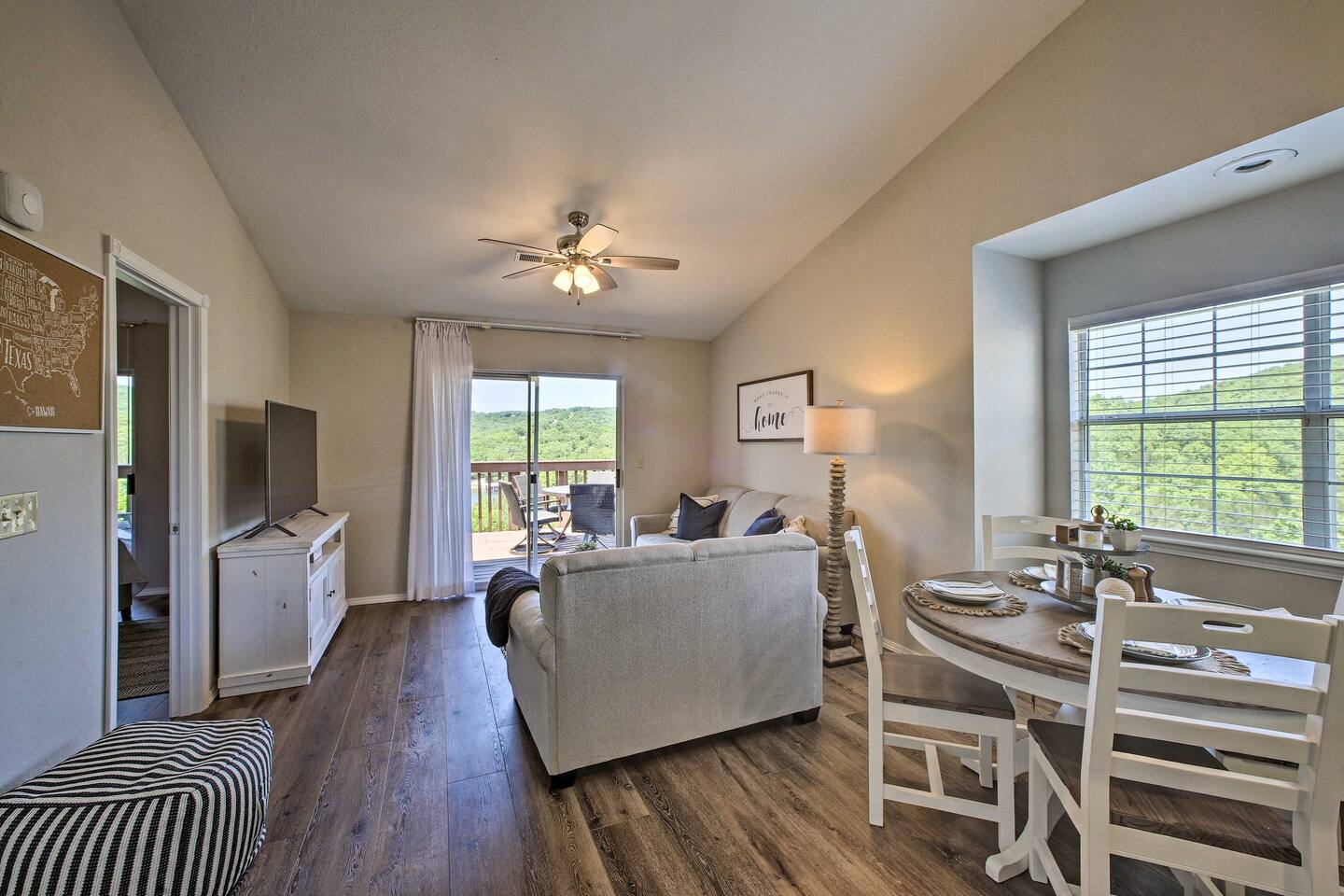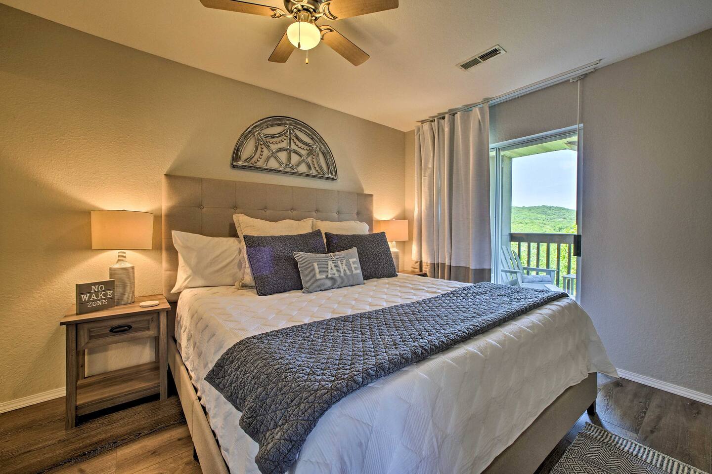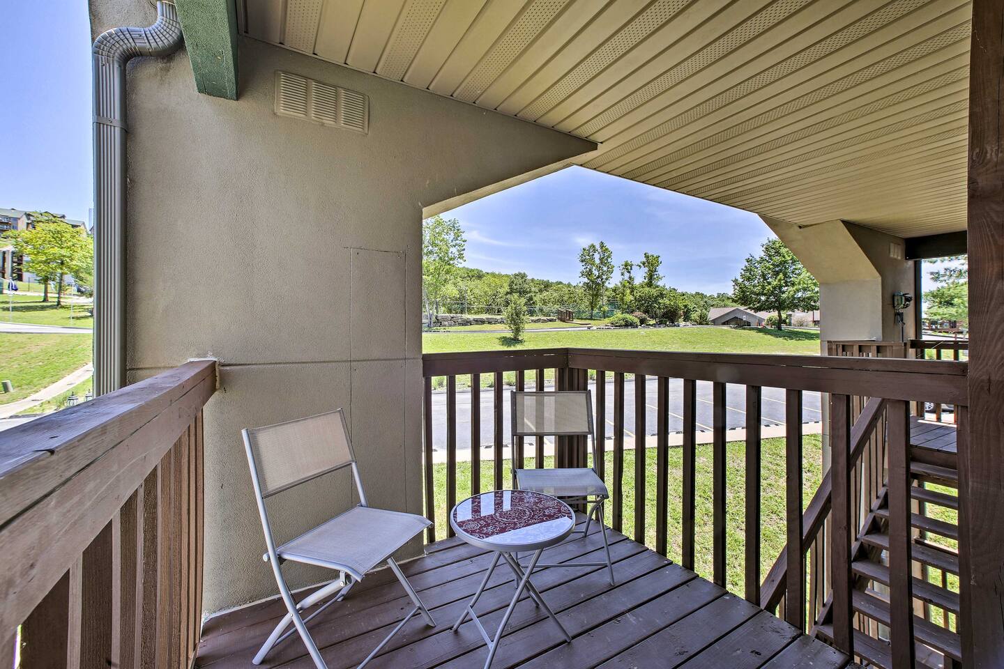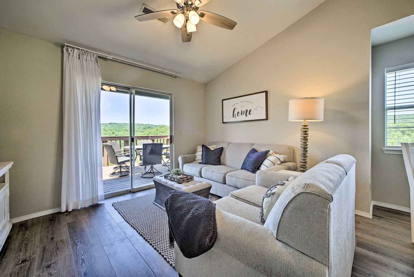 -- THE PROPERTY -- Fully Renovated in Summer of 2019! We outfitted our condo with brand new features and fixtures. This cozy condo welcomes your family home after long days out on the lake or wandering the theme parks! BONUS: Our property is one of 30 in the 200 unit complex that has access to the Indoor and Outdoor Pool w/Splash Pads located in the Landing complex at the top of the hill. Indoor pool is closed from Jan 15 - 31 for repairs. Hours vary by season. If you anticipate early or late use, feel free to check with us for the hours that line up with your reservation dates. Master Bedroom: King Bed with TV, ensuite bathroom, and access to back deck. Bedroom 2: Queen Bed Living Room: 1 Sleeper Sofa (1 full) RESORT AMENITIES: Outdoor pool, hot tub, walking trails to Table Rock Lake, tennis court, playgrounds, basketball hoops, park-style grills. Outdoor pools are typically open from Memorial Day to Labor Day. OUTDOOR LIVING: Mountain and lake views, outdoor dining set INDOOR LIVING: New paint, flooring, furnishings and doors; 4-person dining table, 3 flat-screen cable/Smart TVs KITCHEN: Fully equipped, Keurig coffeemaker, microwave, oven/stove, full-size fridge GENERAL: Free WiFi, in-unit washer/dryer, linens/towels, Pack 'n Play PARKING: Community lot (2 vehicles), on-site trailer parking (with an additional fee)
