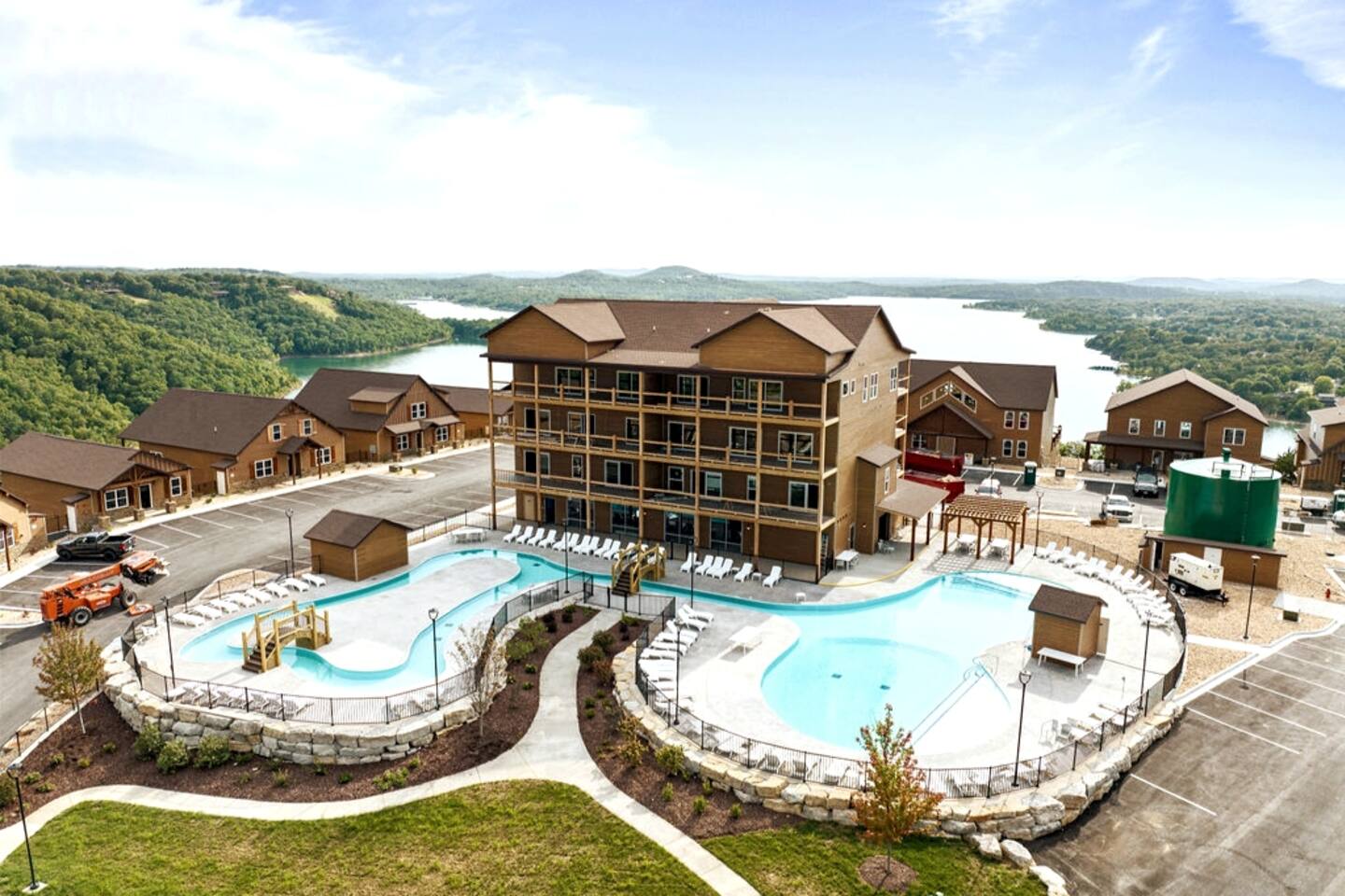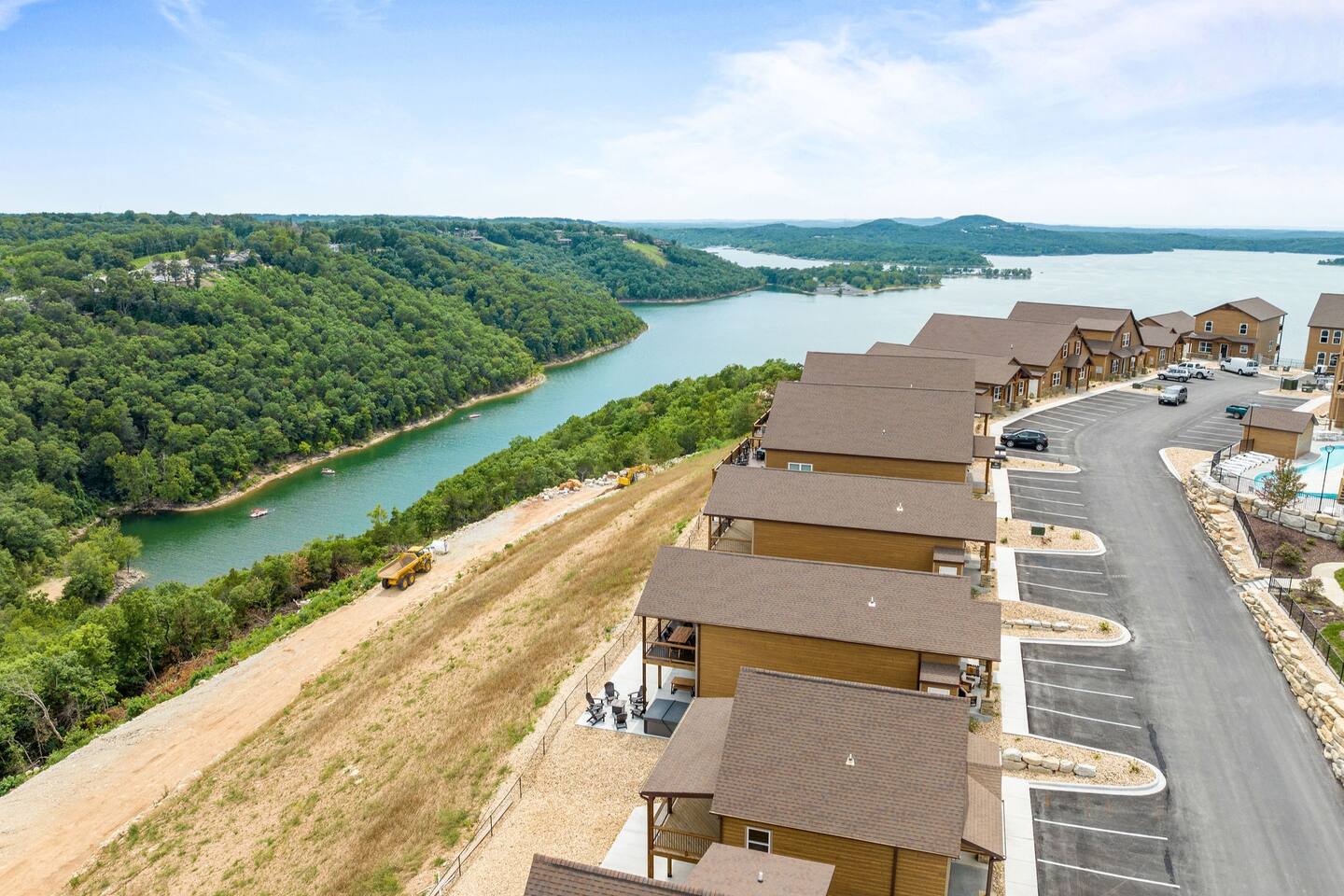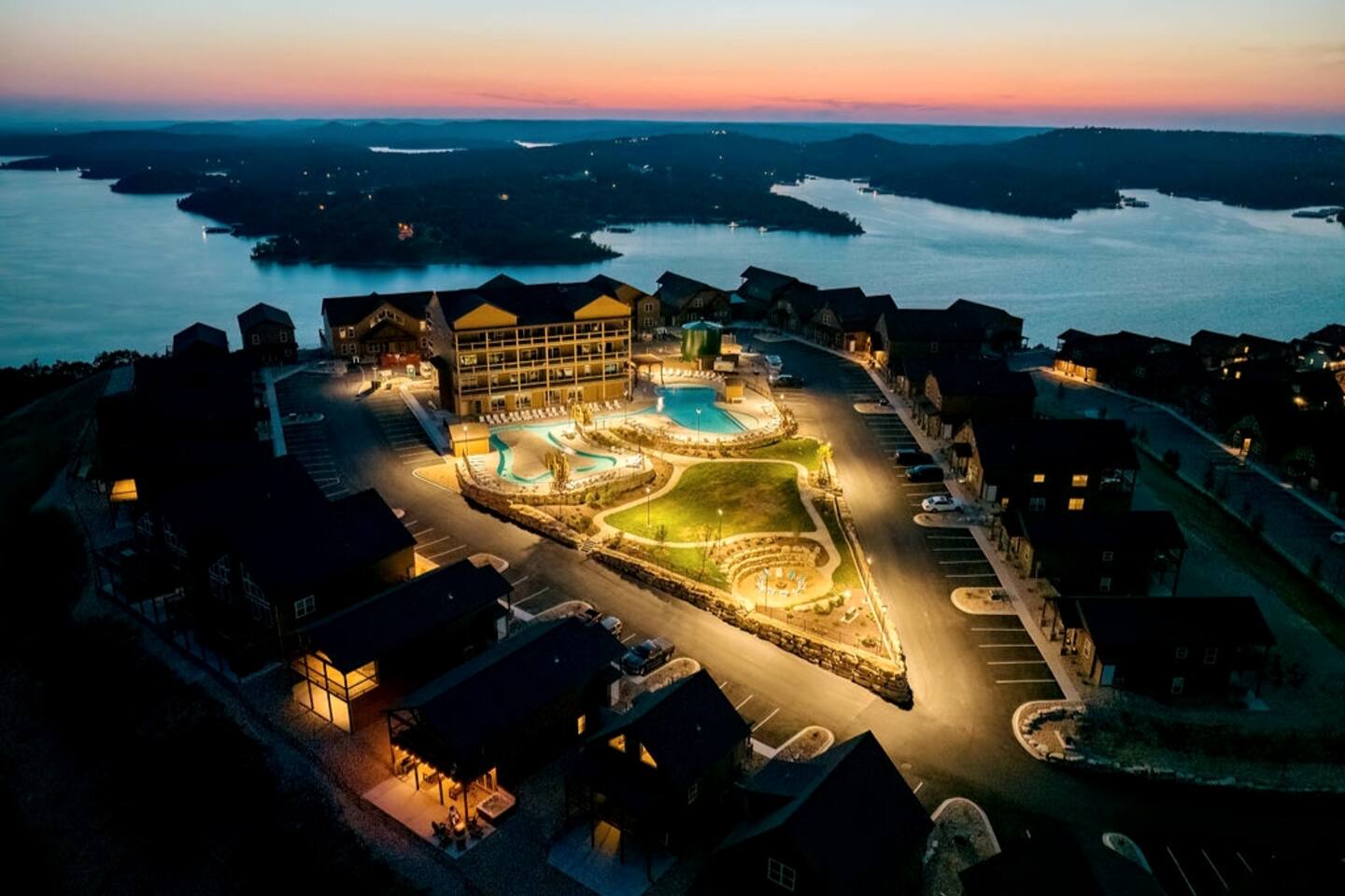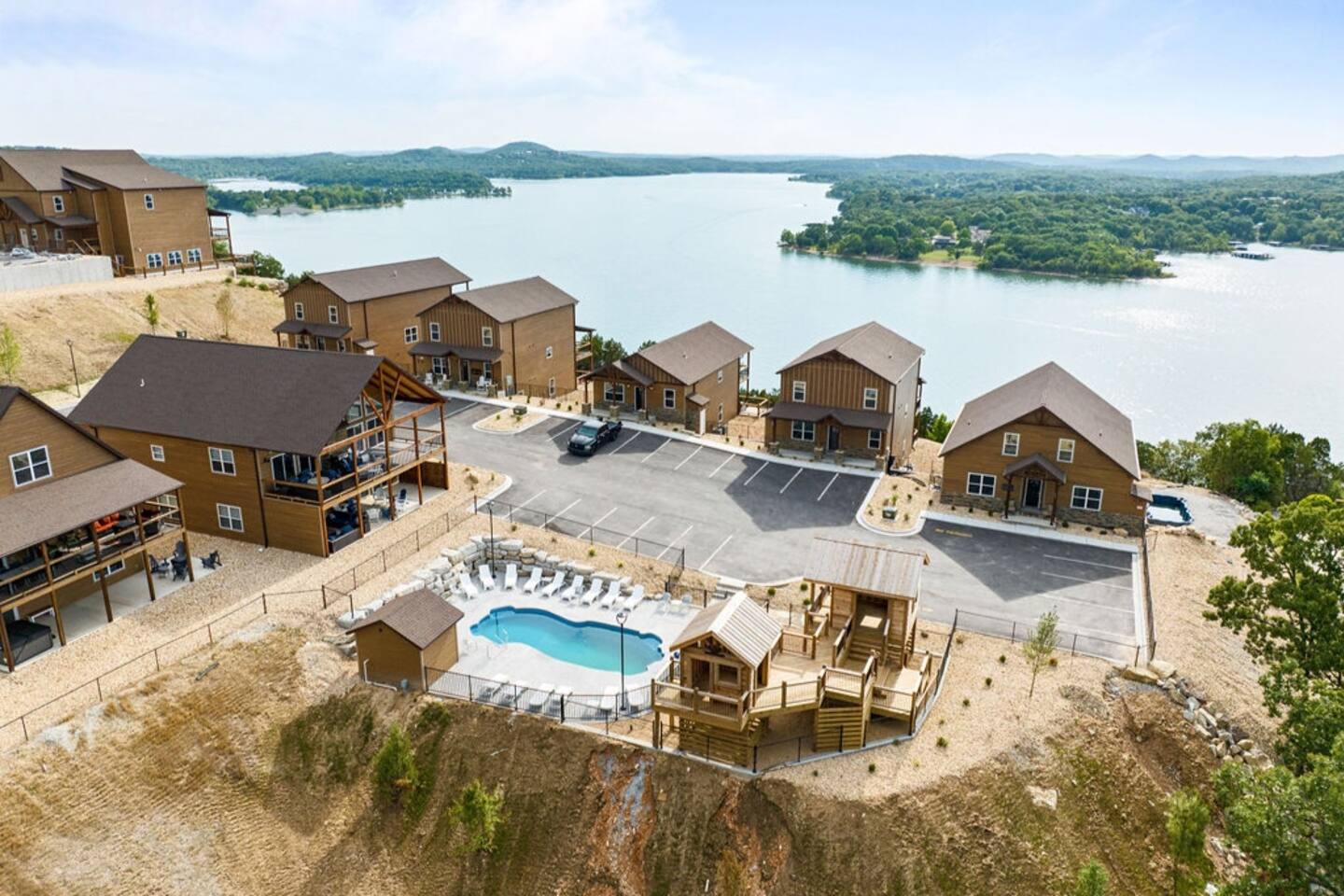 Livin' on the Ledge at Table Rock Lake is a beautiful lodge that was completed in 2023. It features five ensuite bedrooms and a private hot tub, firepit, tailgate gaming area, and arcade room for guests' entertainment. The location is a peaceful setting with just a short drive to Branson's attractions, including Silver Dollar City, White Water, Dogwood Canyon, and Golfing. Wilderness Mountain is a luxurious, lakefront development with stunning views of the Ozark Mountains and Table Rock Lake.