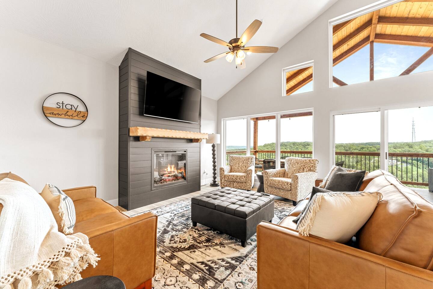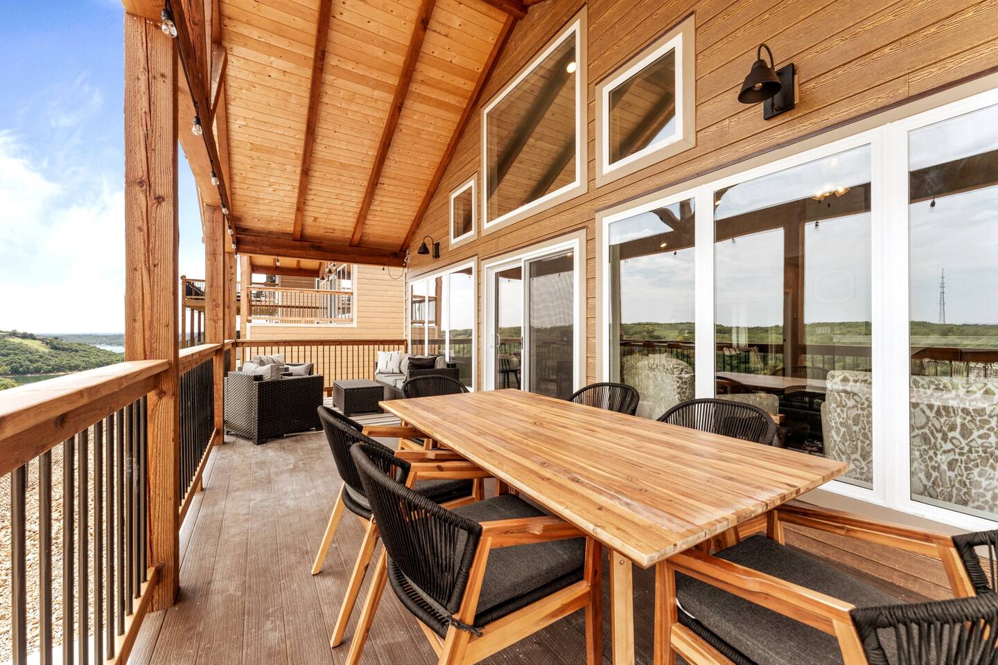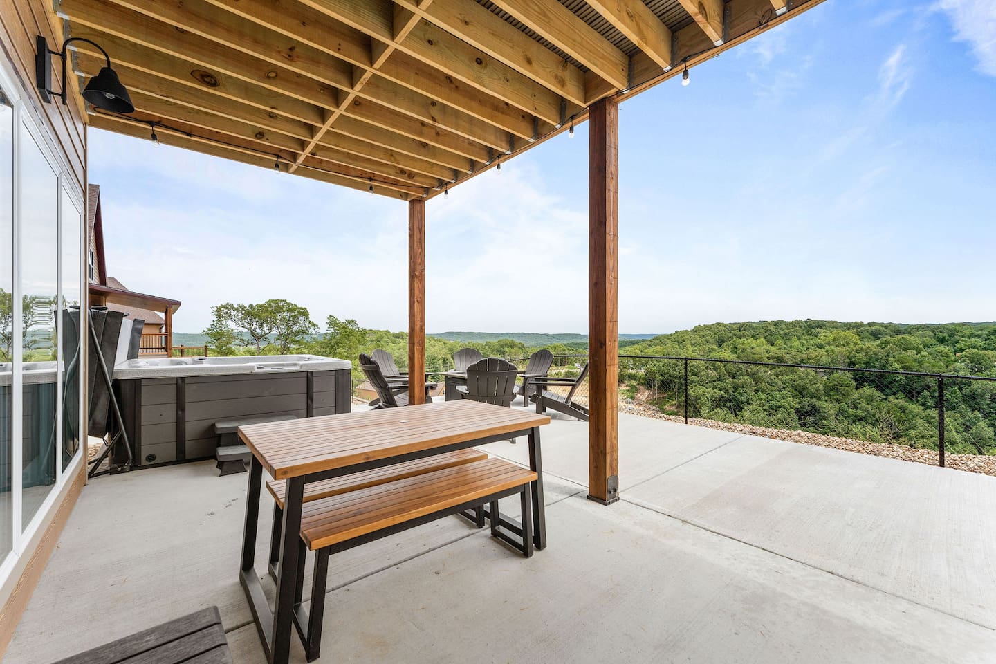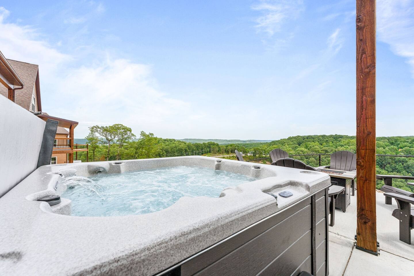 Livin' on the Ledge at Table Rock Lake is a beautiful lodge that was completed in 2023. It features five ensuite bedrooms and a private hot tub, firepit, tailgate gaming area, and arcade room for guests' entertainment. The location is a peaceful setting with just a short drive to Branson's attractions, including Silver Dollar City, White Water, Dogwood Canyon, and Golfing. Wilderness Mountain is a luxurious, lakefront development with stunning views of the Ozark Mountains and Table Rock Lake.