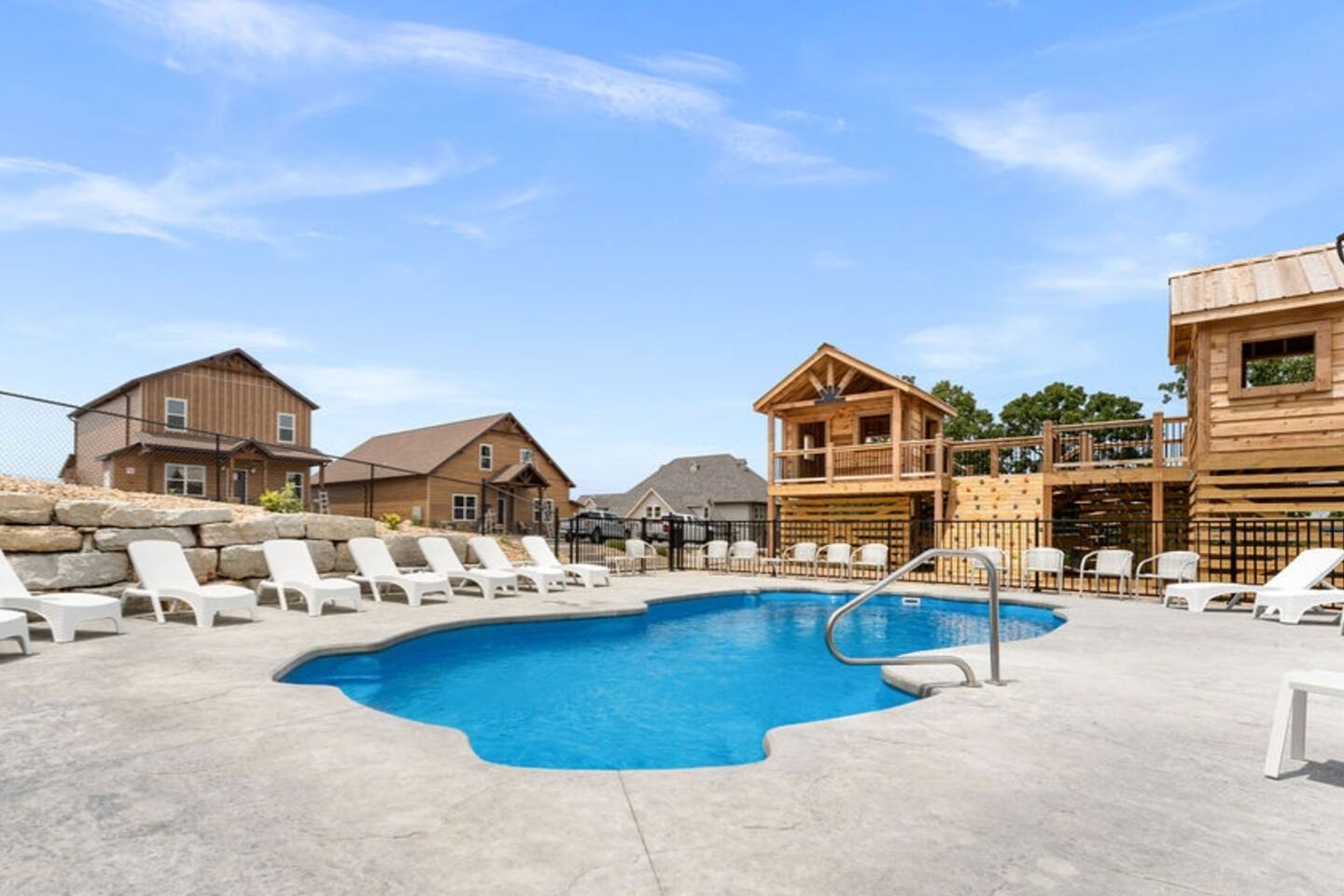 Our 5 bedroom, 5.5 bathroom lodge is thoughtfully designed for your group to make unforgettable memories together. Whether you seek relaxation or entertainment, solitude or togetherness, Livin’ on the Ledge is ready to exceed your expectations. MAIN LEVEL KITCHEN/DINING: Our well-appointed kitchen will allow your family to prepare and serve meals for the whole crew. With dining spots for 15, everyone will have the opportunity to enjoy their meal. We do have a high chair for our tiniest guests and our adult guests will enjoy both a standard carafe as well as a Keurig coffee maker. LIVING ROOM: Our main living room has seating for 7, a 60” TV and electric fireplace. BEDROOM 1: Our first en-suite bedroom offers a custom built king-size bed with two twin trundles and a 40” TV to unwind after a fun-filled day. BEDROOM 2: Our second en-suite bedroom offers an ADA friendly bathroom, king-size bed and a 40” TV. OUTDOOR SPACE: Our back deck features a large dining table as well as wicker lounge furniture to enjoy our multitude of breathtaking views. LOWER LEVEL LIVING ROOM: Our secondary living room offers multiple seating options, a beverage fridge and a 60” TV. GAMING AREA: With flexible seating and (2) 50” TV’s, our guests will enjoy friendly competition on the Playstation 4 or the Retro Nintendo Classic Console with 200+ games. BEDROOM 3: Also known as the bunk room offers a custom built bunk with sleeping spots for 5 with (3) twin beds and (1) full size bed. The bunk room also offers a sitting area for playing with toys, puzzles, and catching a movie on the 40” TV. The bunk room also offers an en-suite bathroom with a full size tub/shower combo. BEDROOM 4: This bedroom is tucked the furthest away from the common spaces, so we’ve added a remote work desk and bench. Additionally, there’s a king-size bed, en-suite bathroom and a 40” TV. We also have a pack ‘n play located in this room for the littlest travelers. BEDROOM 5: Our final bedroom features a king-size bed, 40” TV and is connected to the hall bath. OUTDOOR SPACE: Our back patio offers afternoon shade to enjoy our private hot tub and fire pit as well as an extended area for the putting green, cornhole, ladder ball and other tailgating games. FITNESS: We also have a small collection of fitness equipment in the lower level. Our guests will have access to a yoga mat, adjustable bench, adjustable dumbbells, ab roller and jump rope. RESORT AMENITIES: Our master-planned resort offers first-class, complimentary amenities for our guests. Everyone in your crew will find something to love, whether it be the pools, the lazy river, treehouse play area, pickleball or basketball courts, there’s so much to do here at Wilderness Mountain.